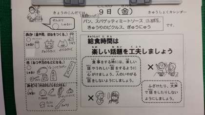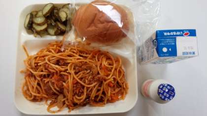 本日の献立は、スパゲッティミートソース、きゅうりのピクルス、黒糖ロールパン、発酵乳です。