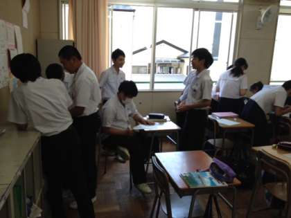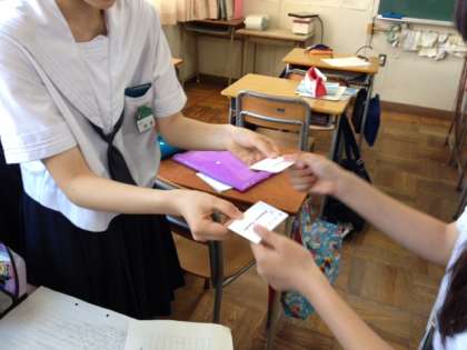 3年2組の英語では現在完了の継続用法を使った自己紹介文を作り、生徒全員の名刺を作ったものをお互いに交換しながら自己紹介しました、