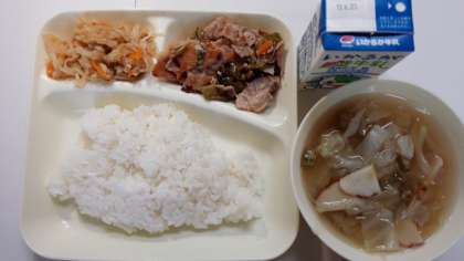 本日の献立は、豚肉の梅風味焼き、すまし汁、切り干しだいこんのいため煮、です。