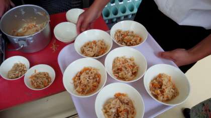 子どもたちは、切り干しだいこんのいため煮を、写真のように、小椀に入れていただきます。
