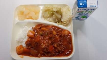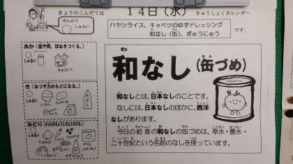 本日の献立は、ハヤシライス、キャベツのゆずドレッシング、和なし(缶づめ)です。