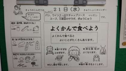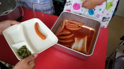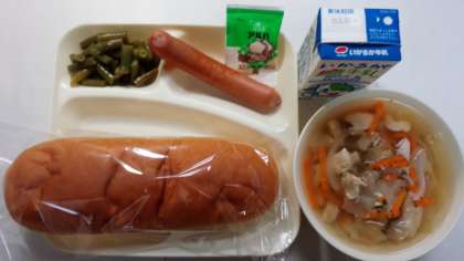 本日の献立は、ウインナーのケチャップソース、三度豆のサラダ、スープ、コッペパン、マーガリンです。