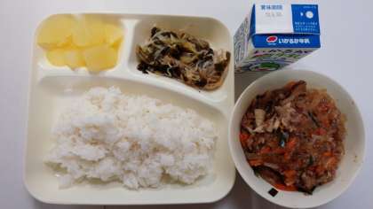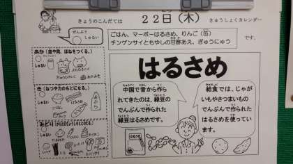 本日の献立は、マーボーはるさめ、チンゲンサイともやしの甘酢あえ、りんご(缶)です。