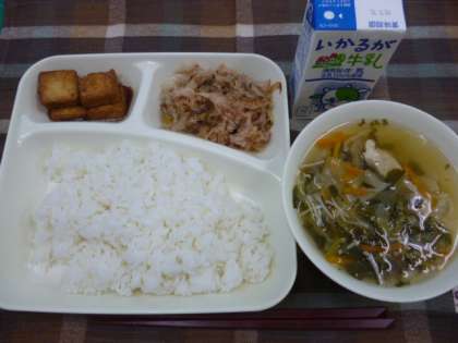 本日の献立は、ゴーヤチャンプルー、五目汁、あつあげのしょうがじょうゆかけ、ごはん、ぎゅうにゅうです。