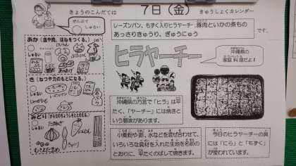 本日の献立は、もずく入りヒラヤーチー、豚肉といかの煮もの、あっさりきゅうり、レーズンパンです。