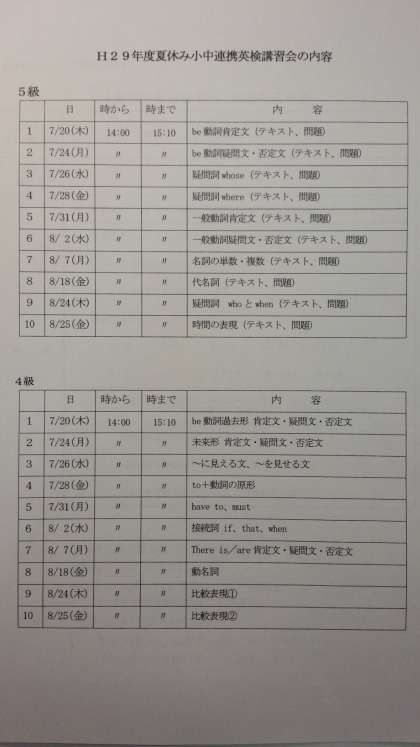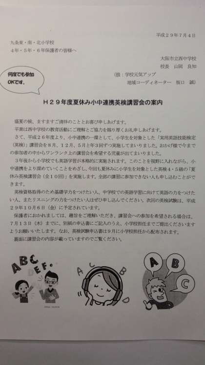 校区4,5,6年生の皆さんに、「夏休み小中連携英検講習会」の案内も配付しています。