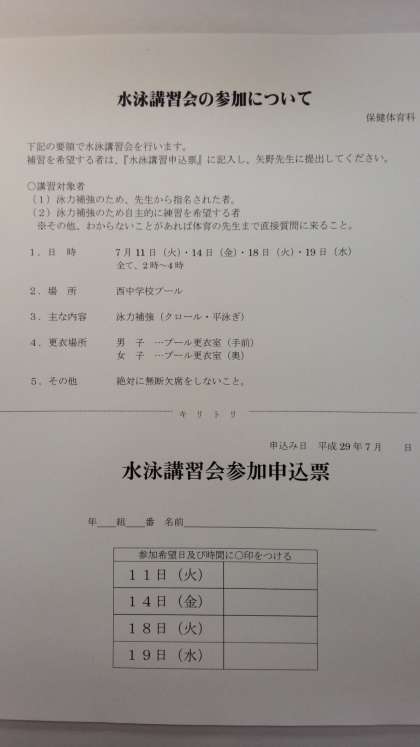 先週の全校集会で夏期講習の話をしましたが、7月11日(火)14日(金)18日(火)19日(水)の4日間、14時〜16時まで、西屋内プールの水泳インストラクター派遣による水泳講習を行います。