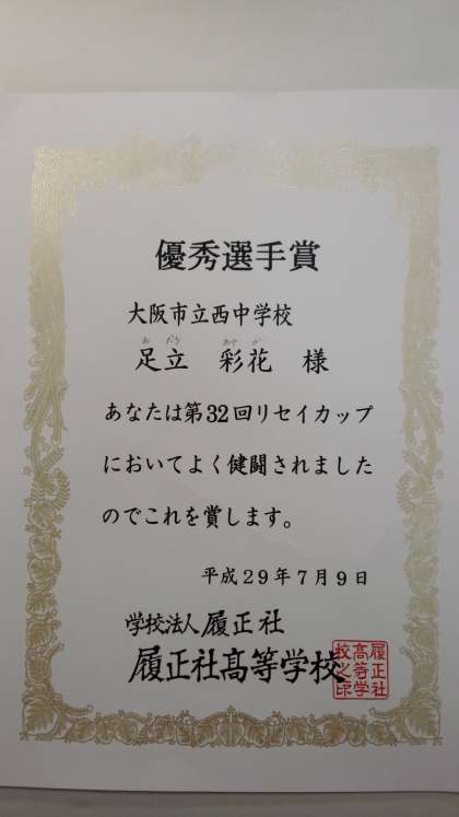 7月9日(日)、本校バレーボール部が「第32回リセイカップ」に出場し、3年2組の足立彩花さんが「優秀選手賞」をいただきました。