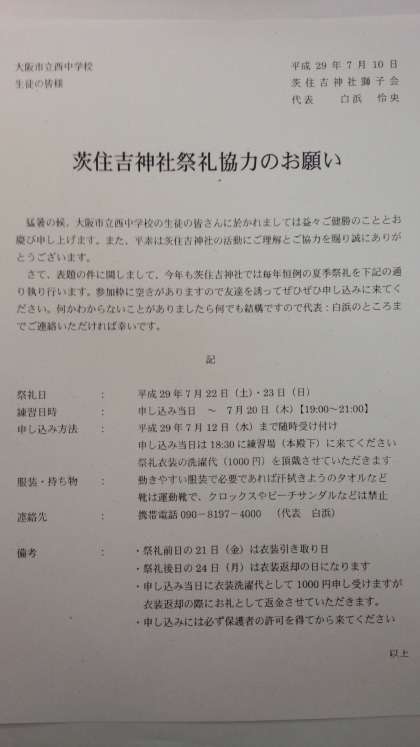 茨住吉神社獅子会様よりの依頼により「茨住吉神社祭礼協力のお願い」を配付しています。