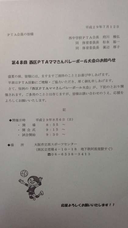 本日、西区PTAママさんバレーボール大会のお知らせを配付しています。