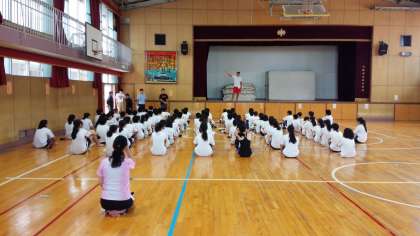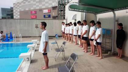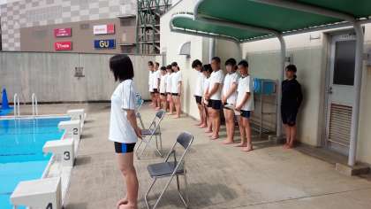 体育館で、準備体操をして、プールに移動して、開会式を行いました。