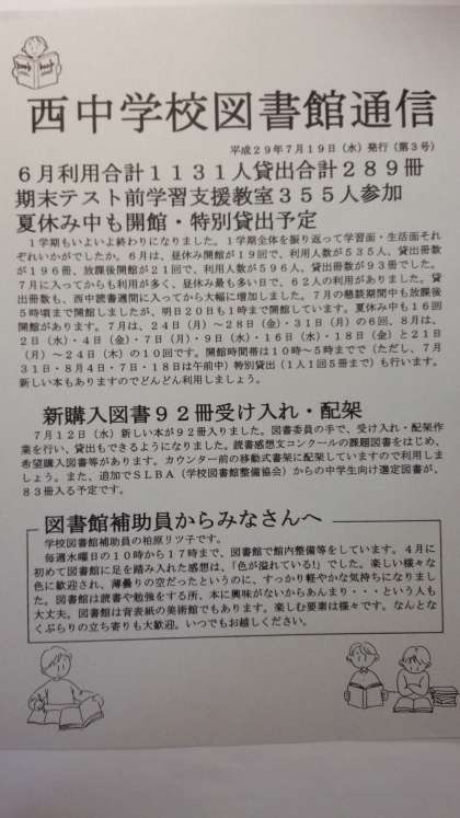 夏休み中の開館日、図書館補助員の柏原先生からのメッセージも載っていますので是非ご覧ください。