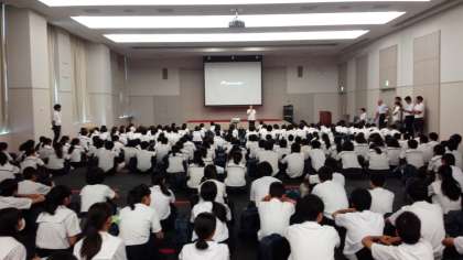 昨年度は、修学旅行で知覧平和学習を行った3年生学級代表のみなさん、そして、生徒会執行部のみなさんに、取り組みの報告と絵本の朗読をしてもらいました。