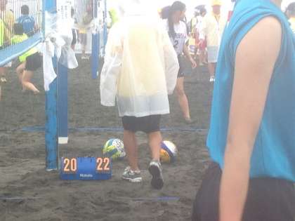 前日の予選グループ戦を2勝で突破し、8月14日(月)決勝トーナメント戦に進出しましたが、降雨悪天候のため、全試合21点1セットマッチで行われました。