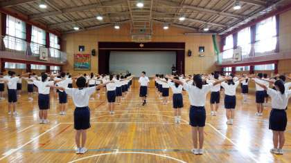 時間割を入れ替えて、2時限目の体育の時間に、3クラス揃って3年生集団演技練習を行いました。