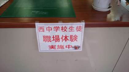 玄関を入ったカウンターに、「職場体験実施中」と貼っていただいています。ありがとうございます。