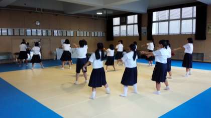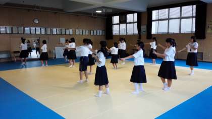 放課後、武道場では、3年生集団演技の「恋ダンス」の部分の練習が行われています。