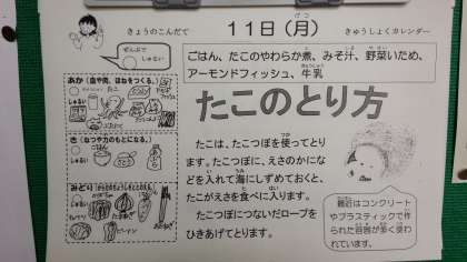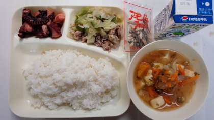 本日の献立は、たこのやわらか煮、野菜炒め、みそ汁、アーモンドフィッシュ、ごはん、牛乳です。