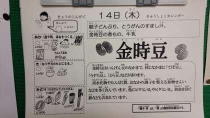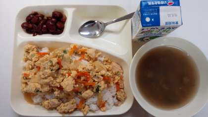 本日の献立は、親子丼、とうがんのすまし汁、金時豆の煮もの、牛乳です。