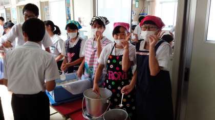 3年生廊下を回っていると、給食当番で配膳している女子生徒たちが「ホームページに載せてください!」と笑顔で声をかけてくれました。