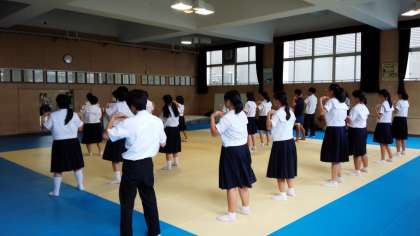 放課後、武道場では、集団演技の「恋ダンス」の部分の練習が行われています。