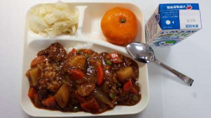 本日の献立は、ビーフカレーライス、キャベツのピクルス、冷凍みかん、牛乳です。