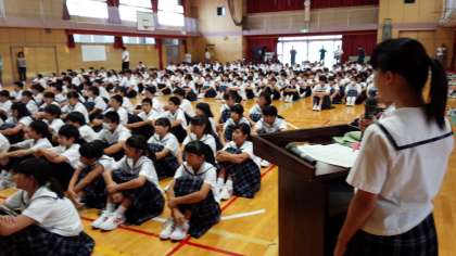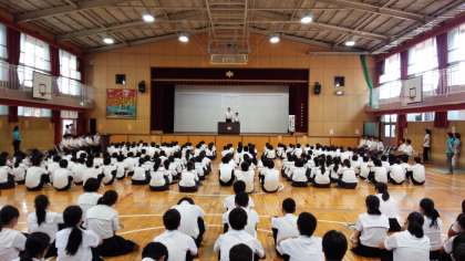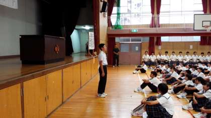 司会は2年3組松田さん、はじめの言葉は3年1組田中くんです。