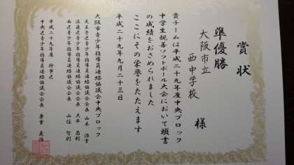 準優勝でしたので、11月19日(日)に大阪城公園グラウンドで開催される「大阪市中学生親善スポーツ大会」ソフトボールの部に、中央ブロック2位で出場します。