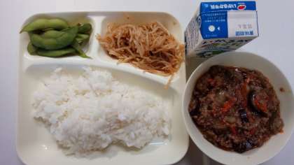 本日の献立は、マーボーなす、もやしのごま酢あえ、枝豆、ごはん、牛乳です。