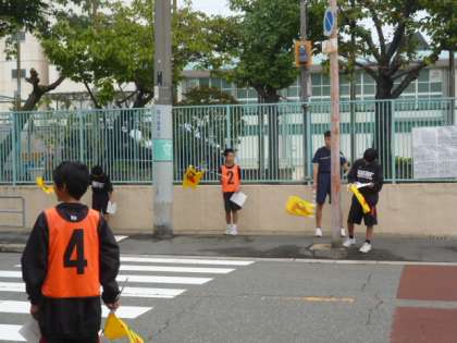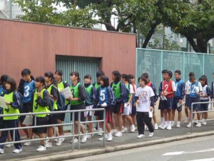 ナンバーゼッケンを付け、まず初めは歩道を渡る安全補助です。