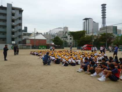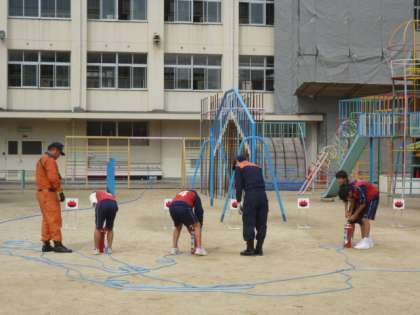 中学生も防災訓練に行い、小学生と一緒に、西消防署の方から講話を聞きました。