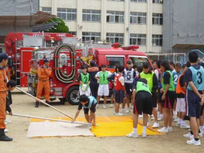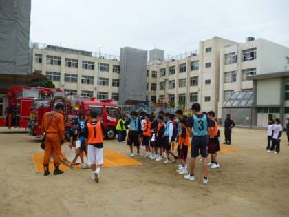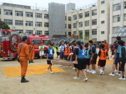 最後に、簡易タンカをつくっての、災害発生時の負傷者を運ぶ訓練を行いました。
