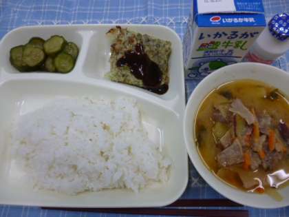 本日の献立は、お好み焼き、豚汁、きゅうりの梅風味、ごはん、牛乳、発酵乳です。