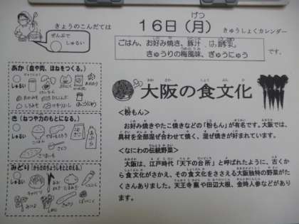本日のメニューは、大阪の食文化である「粉もん」(お好み焼きやたこ焼き)メニューとなっています。