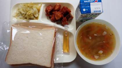 本日の献立は、まぐろのオーロラ煮、サワーキャベツ、じゃがいものスープ、食パン、はちみつ、牛乳です。