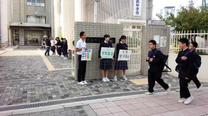 朝早くから、後期生徒会役員が、正門で、学年集会の呼びかけを行ってくれています。