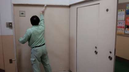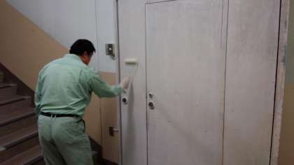 先日の、体育館への渡り廊下に続いて、今日から、1階の防火扉のペンキ塗りです。