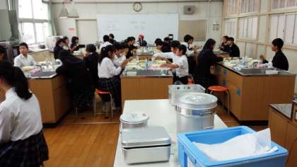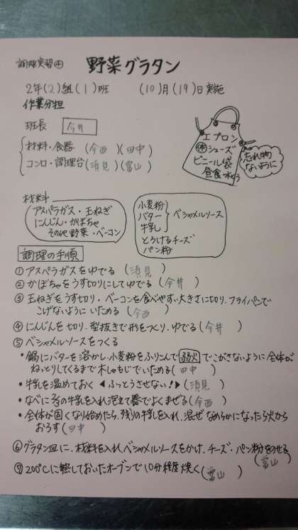 昨日、2年2組は調理室で給食と野菜グラタンをいただきました。