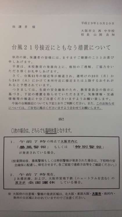 台風21号接近にともなう措置について