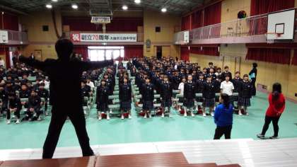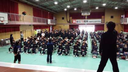また、屋上に張り出していた「祝創立70周年」の横垂れ幕を、体育館内に飾りました。