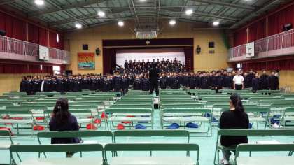 パート練習に続いて、今日は、3年生が舞台上に並んで、1,2年生が保護者席を向いて歌う練習をしました。