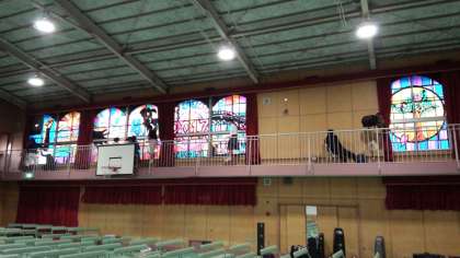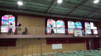 体育館に入ると、2階の窓には、2年生全員で作成した「ステンドグラス」が飾られています。