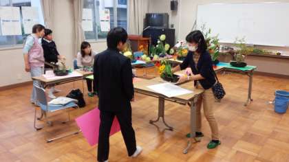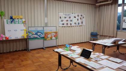多目的室には、華道部の生け花、大空教室の作品、英語科2年の英語絵本、親子給食試食会で展示した保健委員会の作品が展示されています。