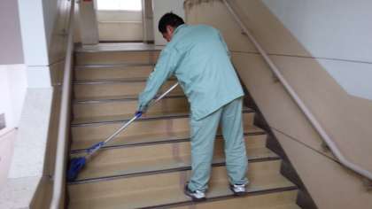 いつも通り、雨の朝は、管理作業員さんが、生徒の登校後、廊下、階段等、雨に濡れたところをモップで拭いてくださっています。