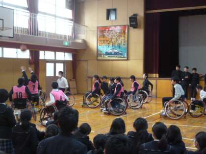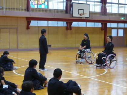 用具の説明もお聞きして、生徒たちも車椅子バスケットボールを体験しました。
