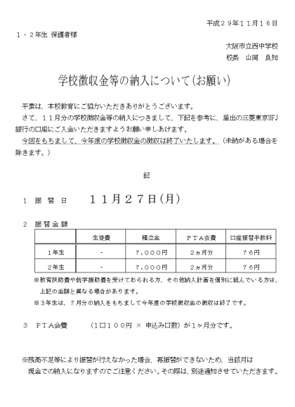 本日、1・2年生の保護者様宛に「学校徴収金等の納入について(お願い)」を配付致しました。