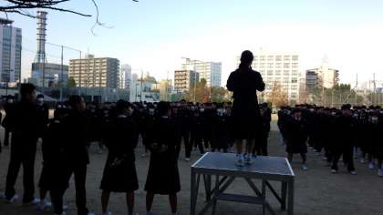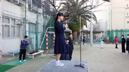 全校集会の最後に、前期生徒会会長の大西さんから、ペットボトルのキャップ集めへの協力のお礼、後期生徒会会長の木原さんから、引き続き、後期もペットボトルのキャップ集めを継続するお願いがありました。