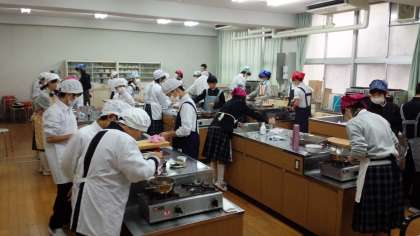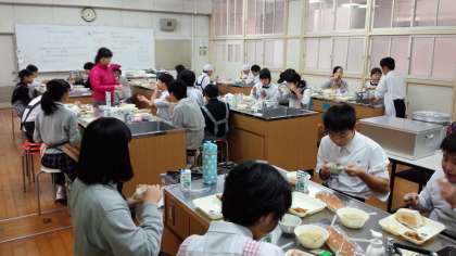 1年1組は、ひきつづき調理室で、給食と一緒に「大根と豚ばら肉の煮物」をいただきました。