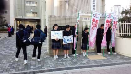 今日も、生徒会役員のみなさんが、あいさつ運動とともに、2年生学年集会の呼びかけを行ってくれています。