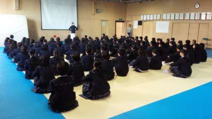 本日の2年生の学年集会は、体育館工事中のため、武道場で行いました。
